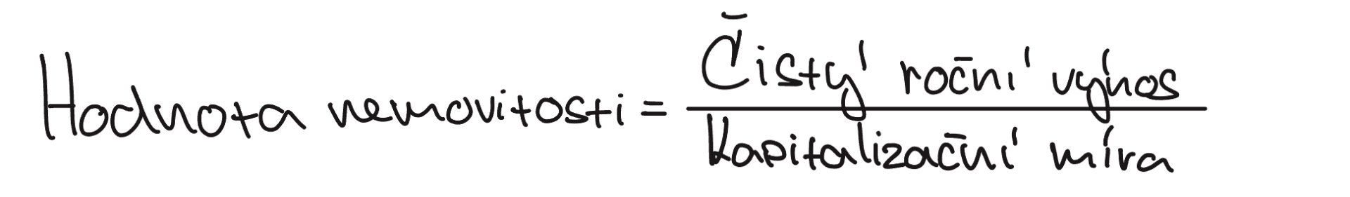 Jakmile známe čistý roční příjem a máme stanovenou kapitalizační míru, můžeme vypočítat hodnotu nemovitosti. Stačí čistý roční výnos vydělit kapitalizační mírou.