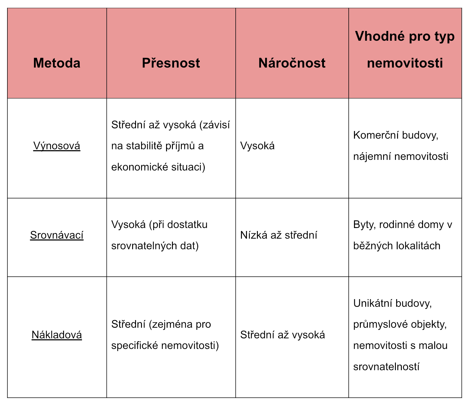 Na závěr přidávám přehled jednotlivých metod oceňování nemovitosti: